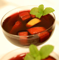 Sangria is such a cool & refreshing summer drink; it always reminds me of the outdoor summer dinner parties my mother sometimes throws for family & friends, out on her porch deck. These get-togethers are fun & casual, low-key affairs. We typically sit around the patio table, umbrella overhead, relaxing and just enjoying the evening. For me, these gatherings signal the middle of summer, usually around July, when the weather is at its hottest. The chilled sangria my mother serves at those parties always manages to hit the spot. :)