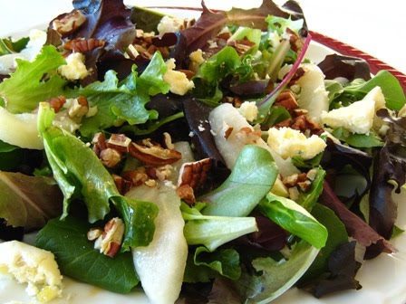 0 Recipe #23: Mesclun & Baby Spinach Greens with Gorgonzola, Pear, & Candied Pecans