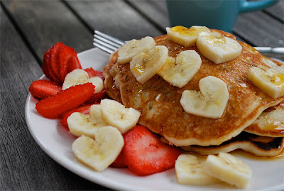 (1) For breakfast, make whole-grain, buttermilk, blueberry pancakes in the shape of a heart & serve with fresh strawberries. Omit the butter & oil, & just make them using 1 c. (whole wheat or multi-grain) flour, 1 tsp. baking powder, 1/2 tsp. baking soda, 1 egg, 1 tsp. vanilla extract, 1 c. non/low-fat buttermilk, & 1/2 c. blueberries. (Makes 10 pancakes.) Instead of using sugary maple syrup, try topping them with homemade strawberry sauce sweetened with honey, & a dollop of either plain non-fat yoghurt or lowfat sourcream. Surprise your parents/mate with breakfast in bed.So, how do you get the pancakes to form into a heart shape? Well, there are a few ways to do this. One way is to free-form it in the pan & get a Picasso-esque, uniquely shaped heart. :) Depending on your skill level &/or luck of the draw, you could end up with this: