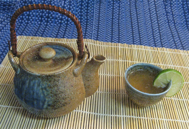 Directions: Bring the (4 c.) water to a rolling boil in a medium-sized sauce pot or tea kettle, about 8 minutes. Add all herbs & spices & continue to boil for another 6-8 minutes. Remove from heat, allow to steep for another 1-2 minutes, strain to remove whole herbs & spices, & then pour into a tea pot. (If it's easier, use heat-proof tongs first to remove the larger pieces -- ginger, lemongrass, cinnamon bark, etc. -- before straining.) Pour into tea cups, add desired amount of lime (or lemon) juice & honey, and serve.